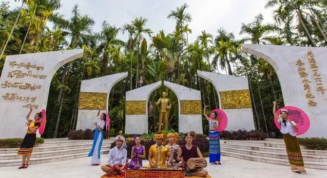 9日下午我们抵达第一个景区——曼听公园,进入曼听公园的大门,首先映入眼帘的是一座纪念周恩来总理身着傣装,左手端水钵,右手持橄榄枝参加泼水的全身铜像。铜像左边是傣王国公主种下的两株象征中泰友谊的菩提树。踏入公园,到处郁郁葱葱,生机盎然,一种回归自然之感油然而生。一路上,我们欣赏着圣洁的曼习龙笋塔,精美的景真八角亭,跟园里的孔雀逗趣,欢歌笑语、温情和谐,也体验了一把“傣王逛御花园”的感觉。