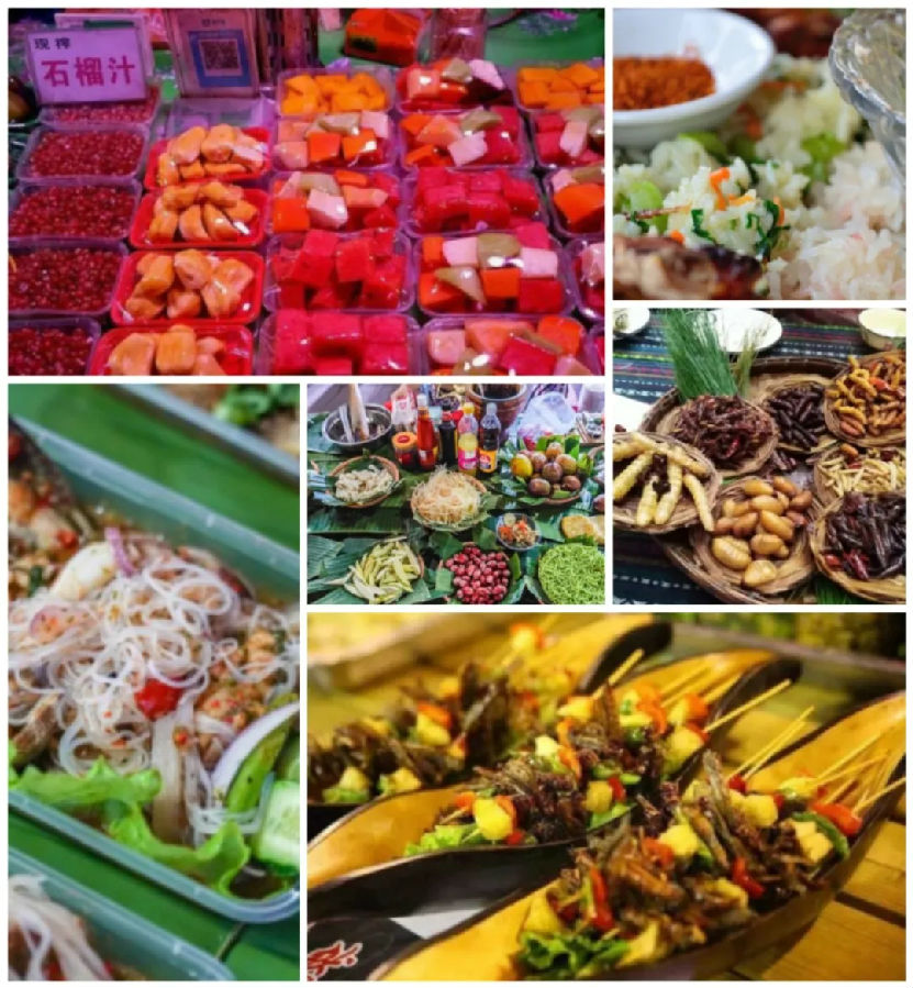 下午我们到了告庄西双景。这里简直就是吃货们的天堂。酸辣的美食,开胃清凉是这里的一大特色,各种水果琳琅满目,物美价廉,还有当地最受欢迎的舂鸡脚、老挝凉拌、虫子宴、傣王御宴、手抓饭等等,非常具有傣家特色。什么也不说了,好好吃饭,是对于美食最基本的尊重,嘻嘻!