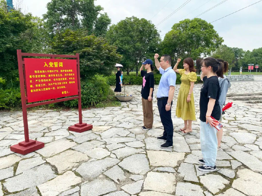 在国歌广场,全体党员在迎风飘扬的五星红旗下,庄重地举起右手,重温对党的虔诚誓言,铭记入党初心,时刻以党员的标准严格要求自己、时刻以党员的先进性鞭策激励自己,以实际行动兑现对党的庄严承诺。